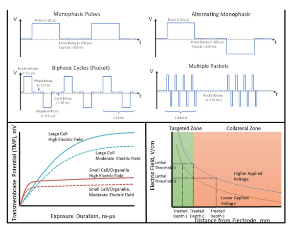 Electroporation protocol variables include voltage, number of pulses, pulse width, shape, delay, and frequency. These parameters and the local tissue properties, such as cell size, geometry, and orientation relative to the electric field vector—as well as catheter shape and electrode arrangement—are crucial in achieving successful IRE.